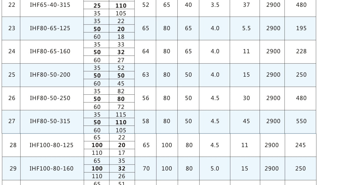性能參數表:電機轉速2900r/min,表中流量揚程加粗為額定參數