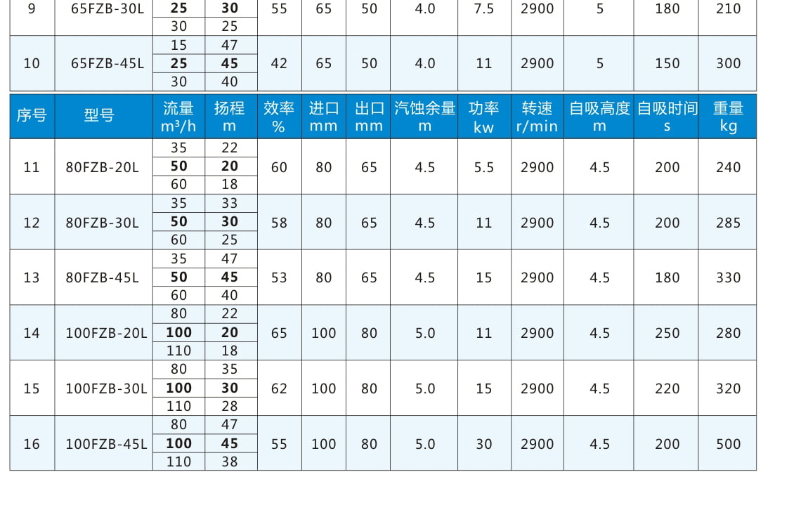 FZB:氟塑料合金自吸泵代號丨 80:進口直徑80mm 丨30:揚程30米 丨L:長支架標準型