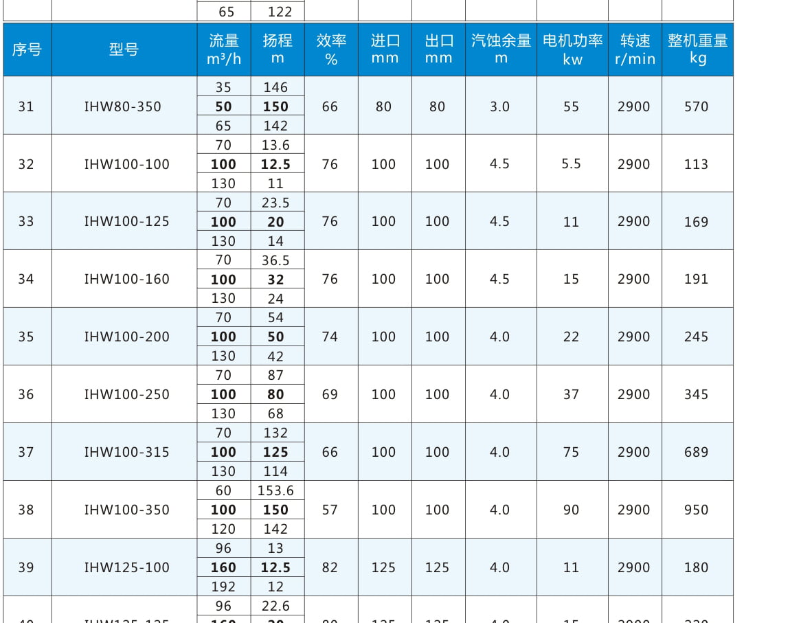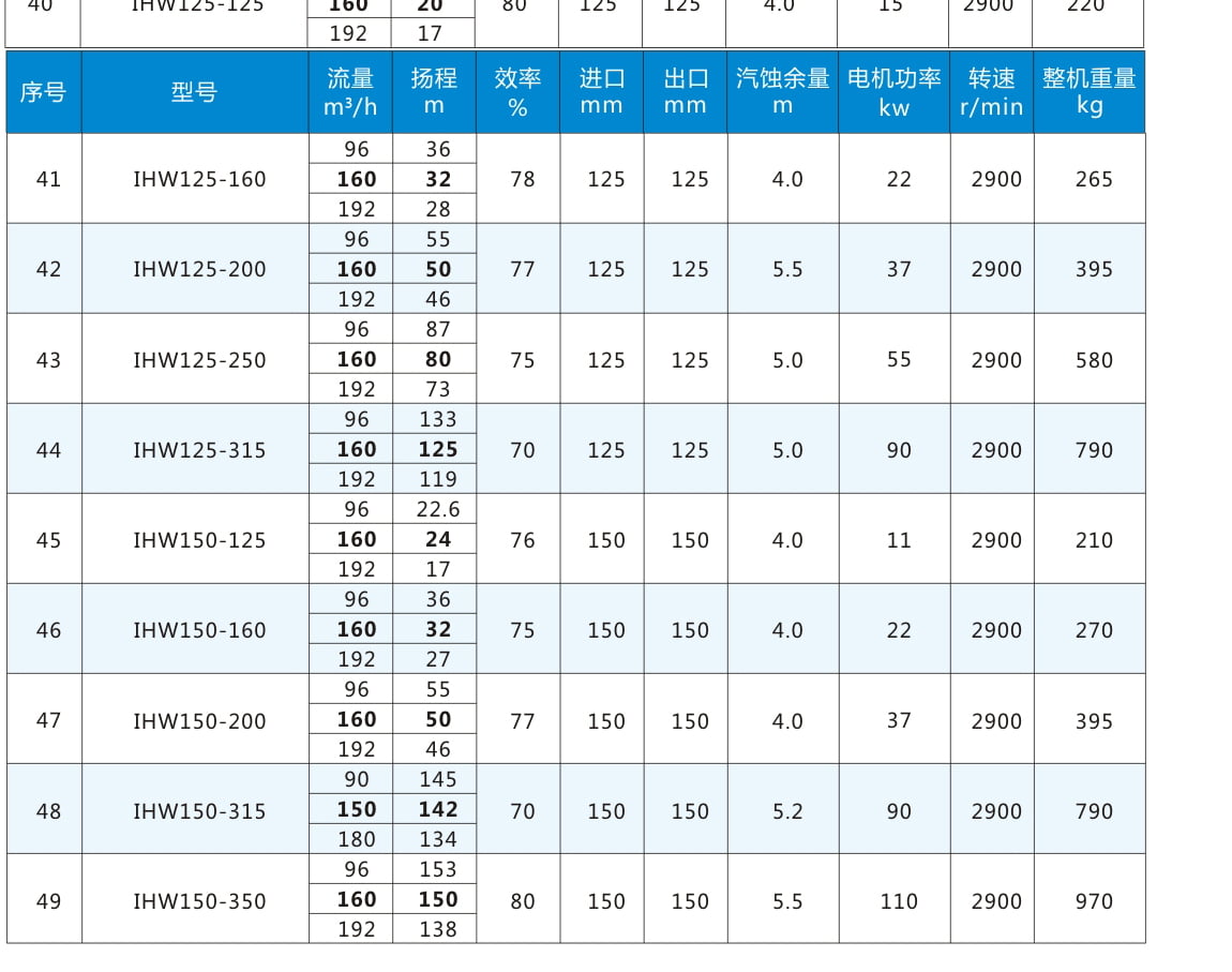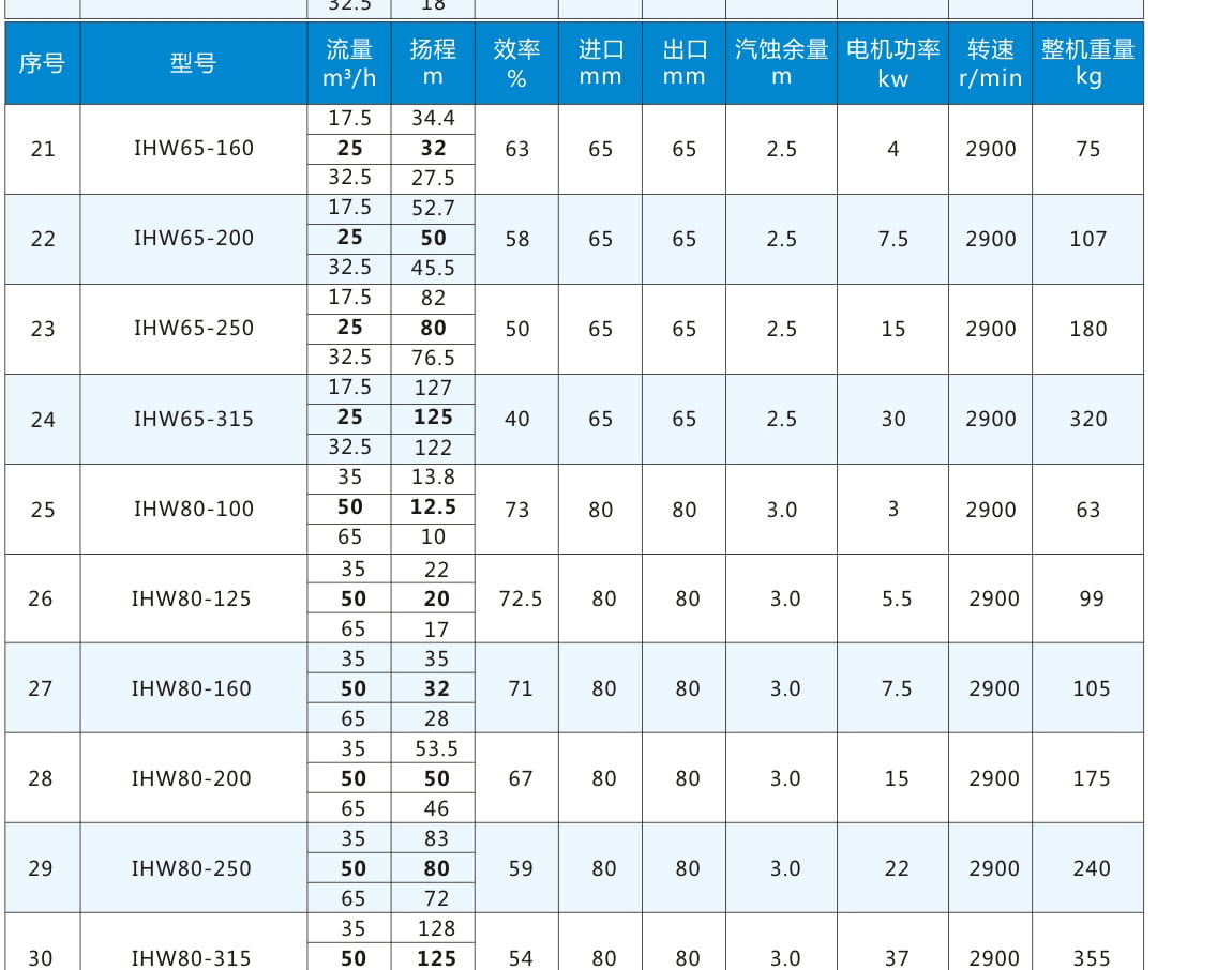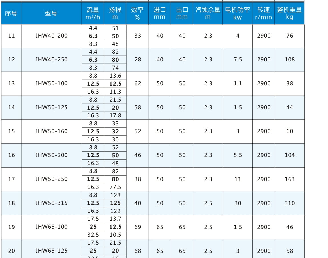 性能參數表:電機轉速2900r/min,表中流量揚程加粗為額定參數