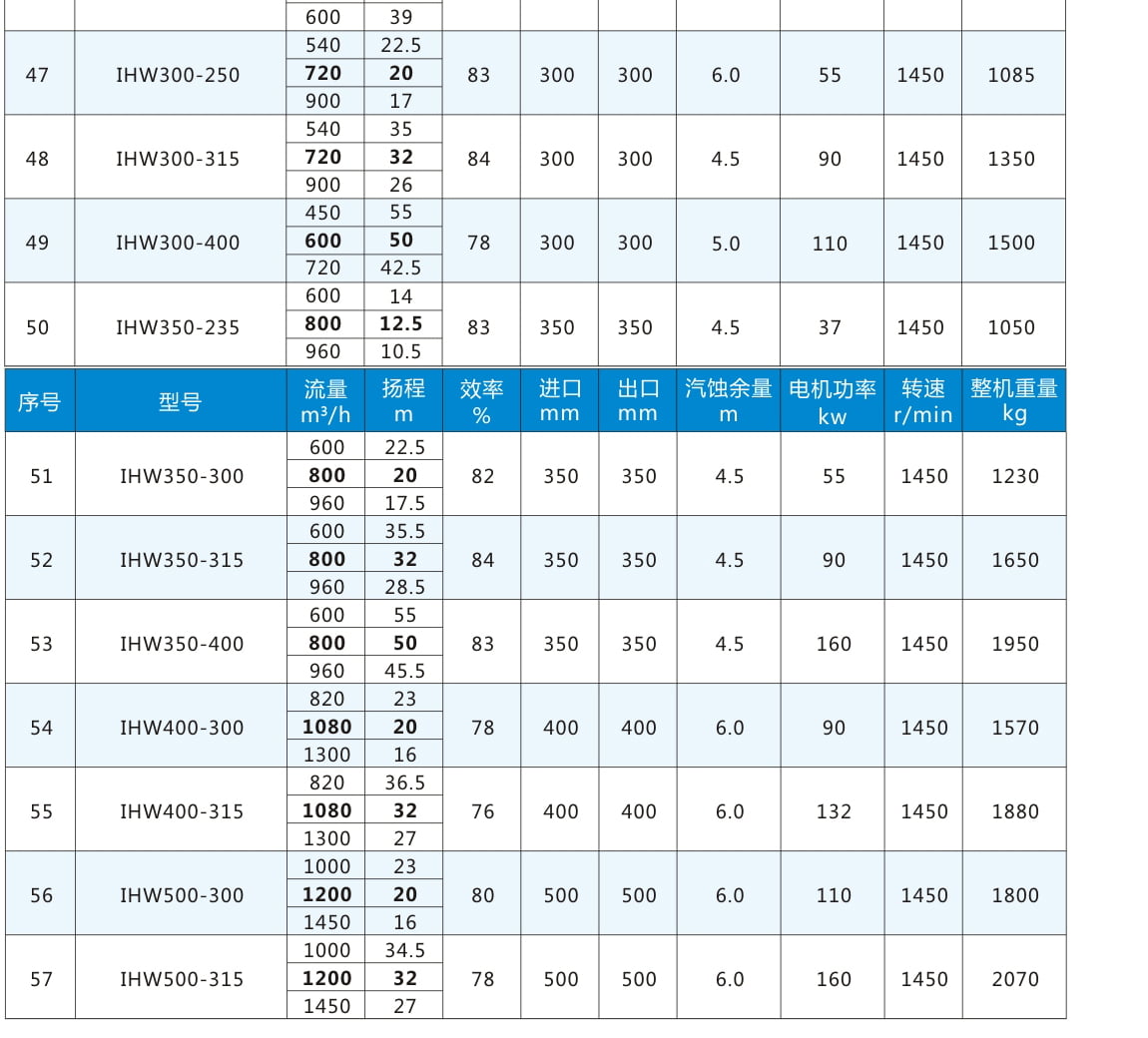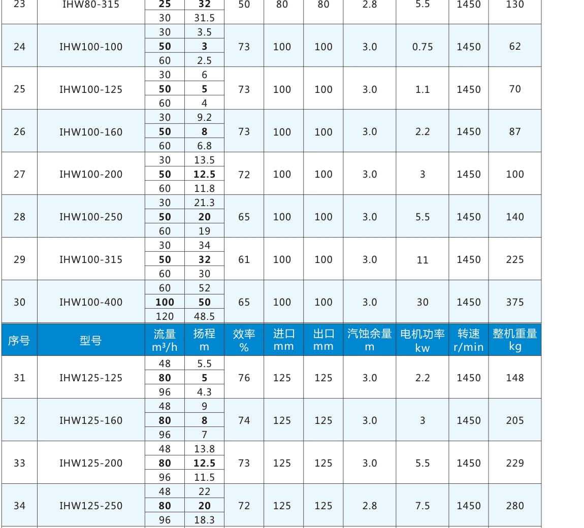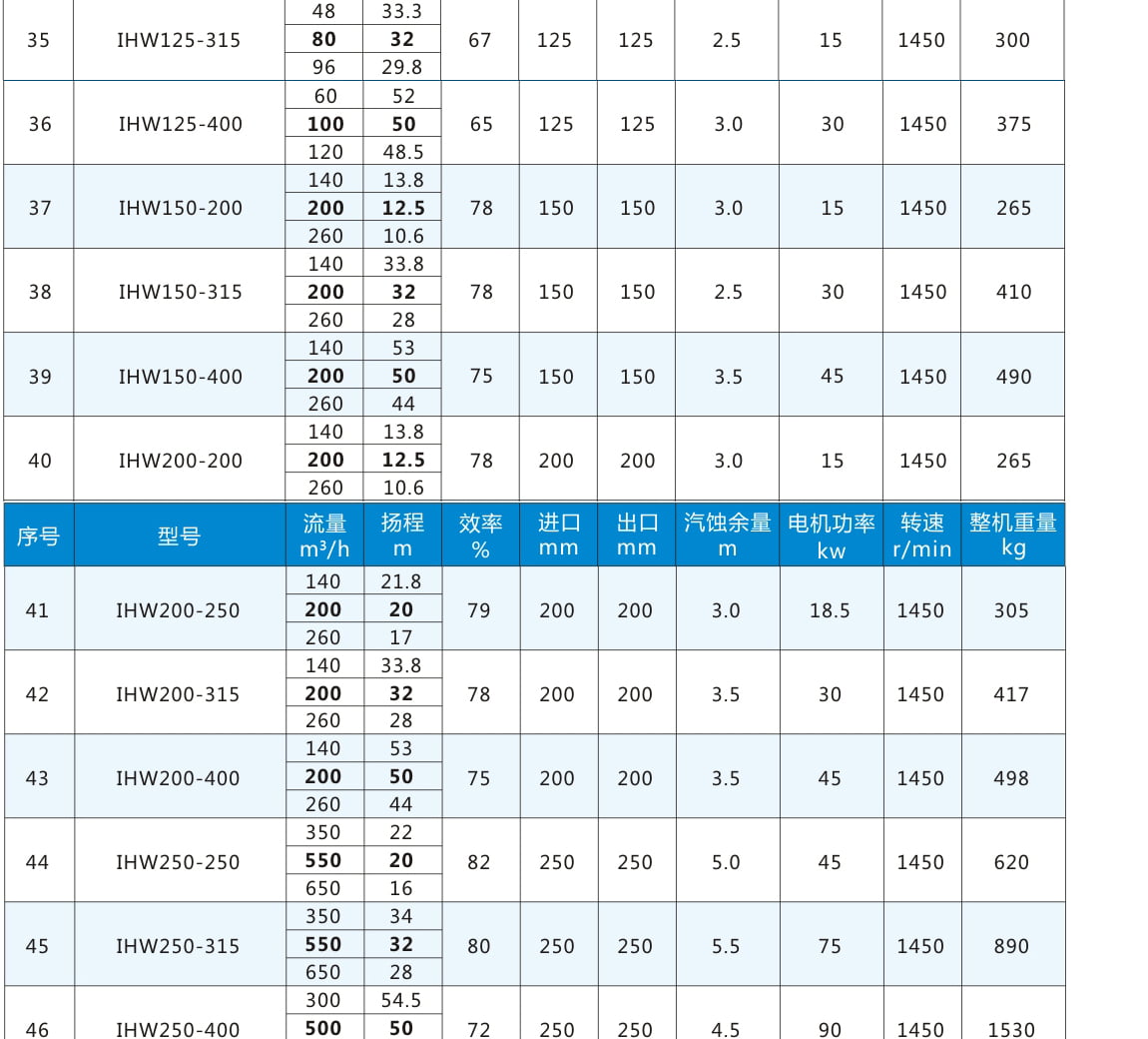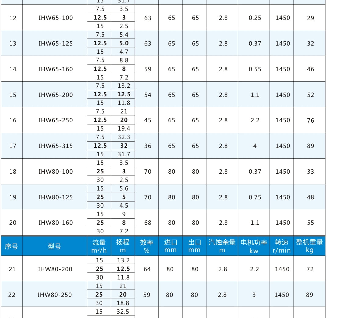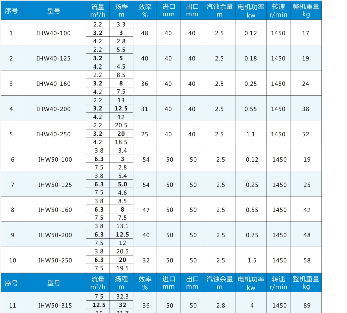 性能參數表二:電機轉速1450r/min,表中流量揚程加粗為額定參數