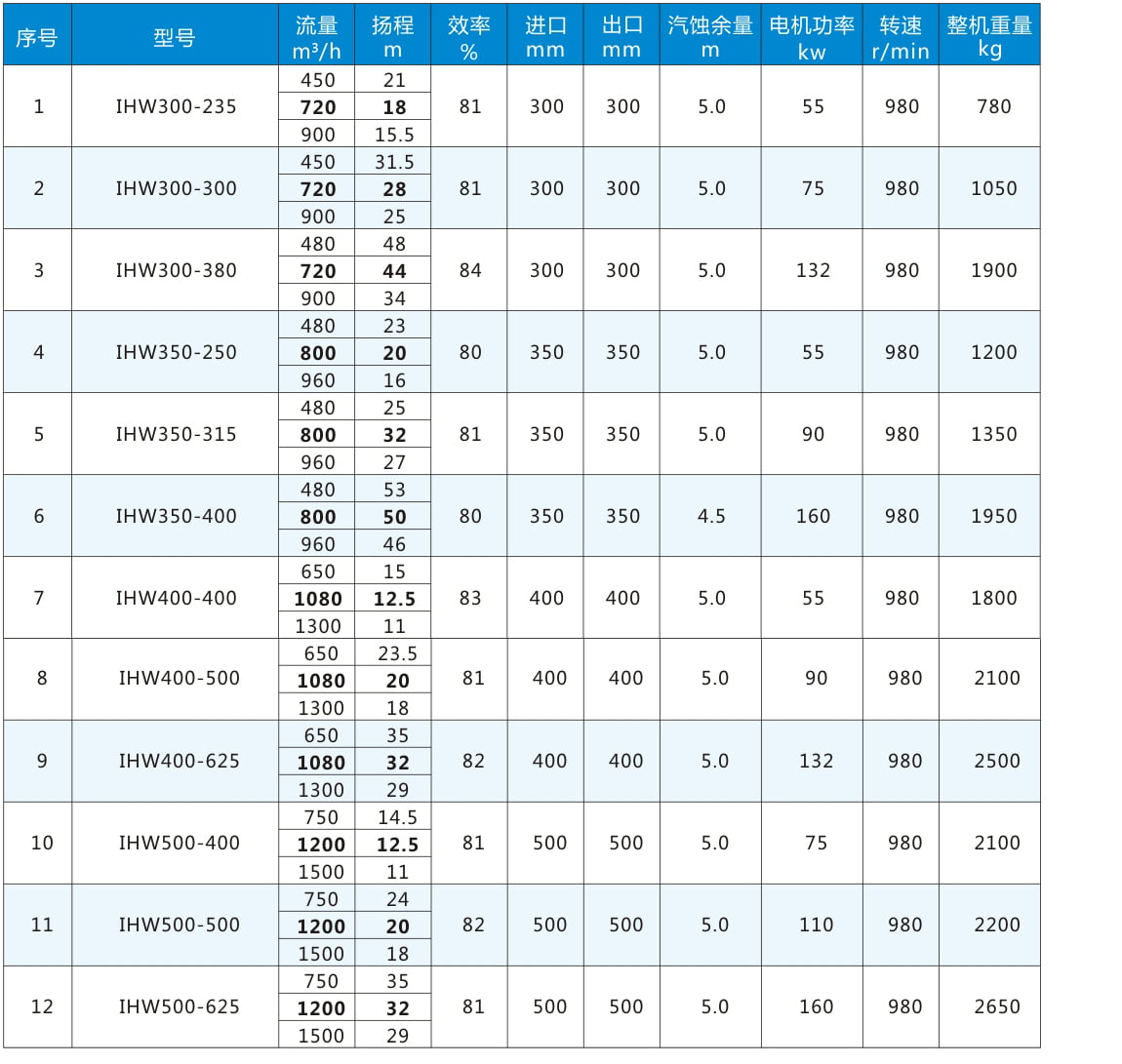 性能參數表三:電機轉速980r/min,表中流量揚程加粗為額定參數