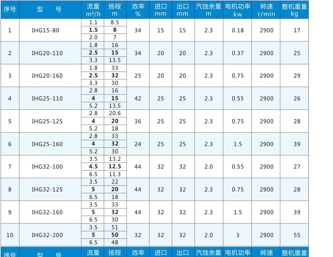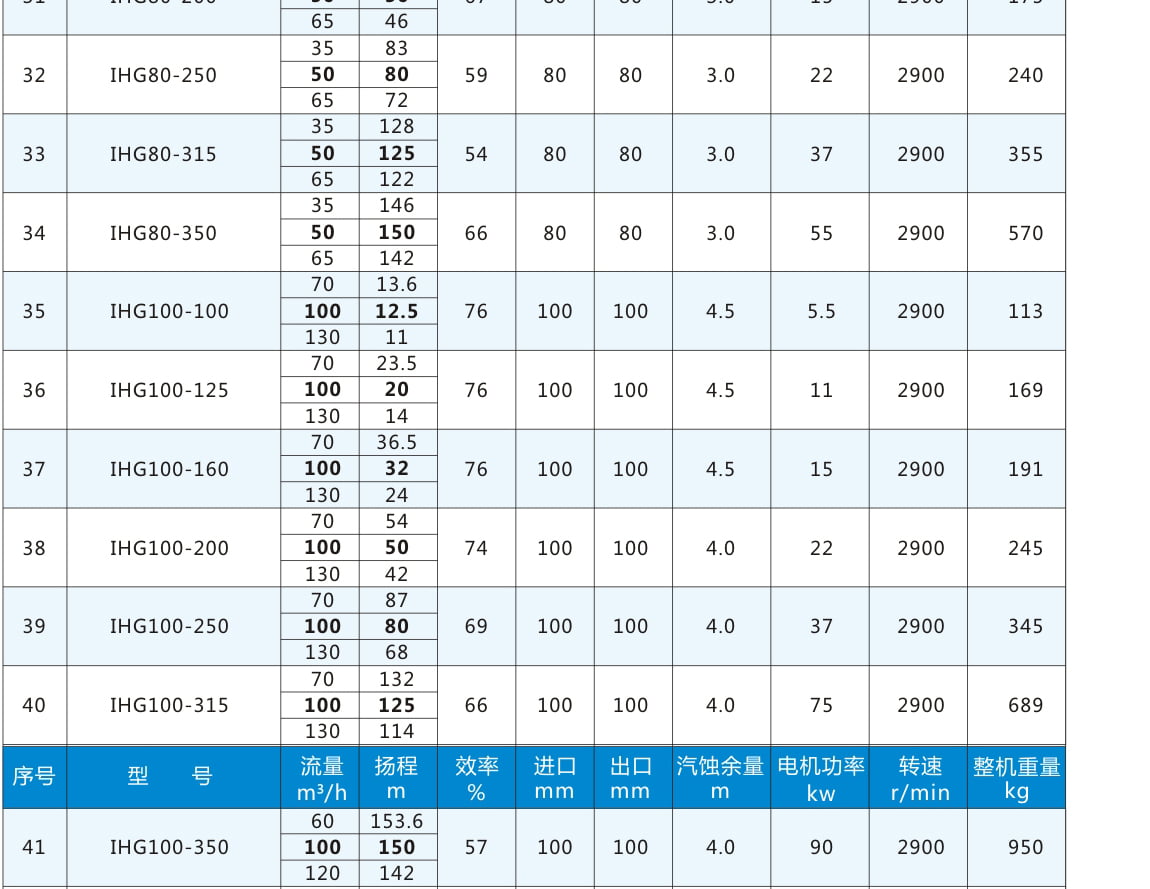 性能參數表:電機轉速2900r/min,表中流量揚程加粗為額定參數