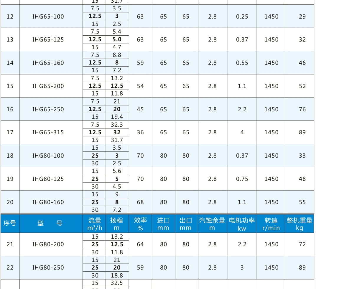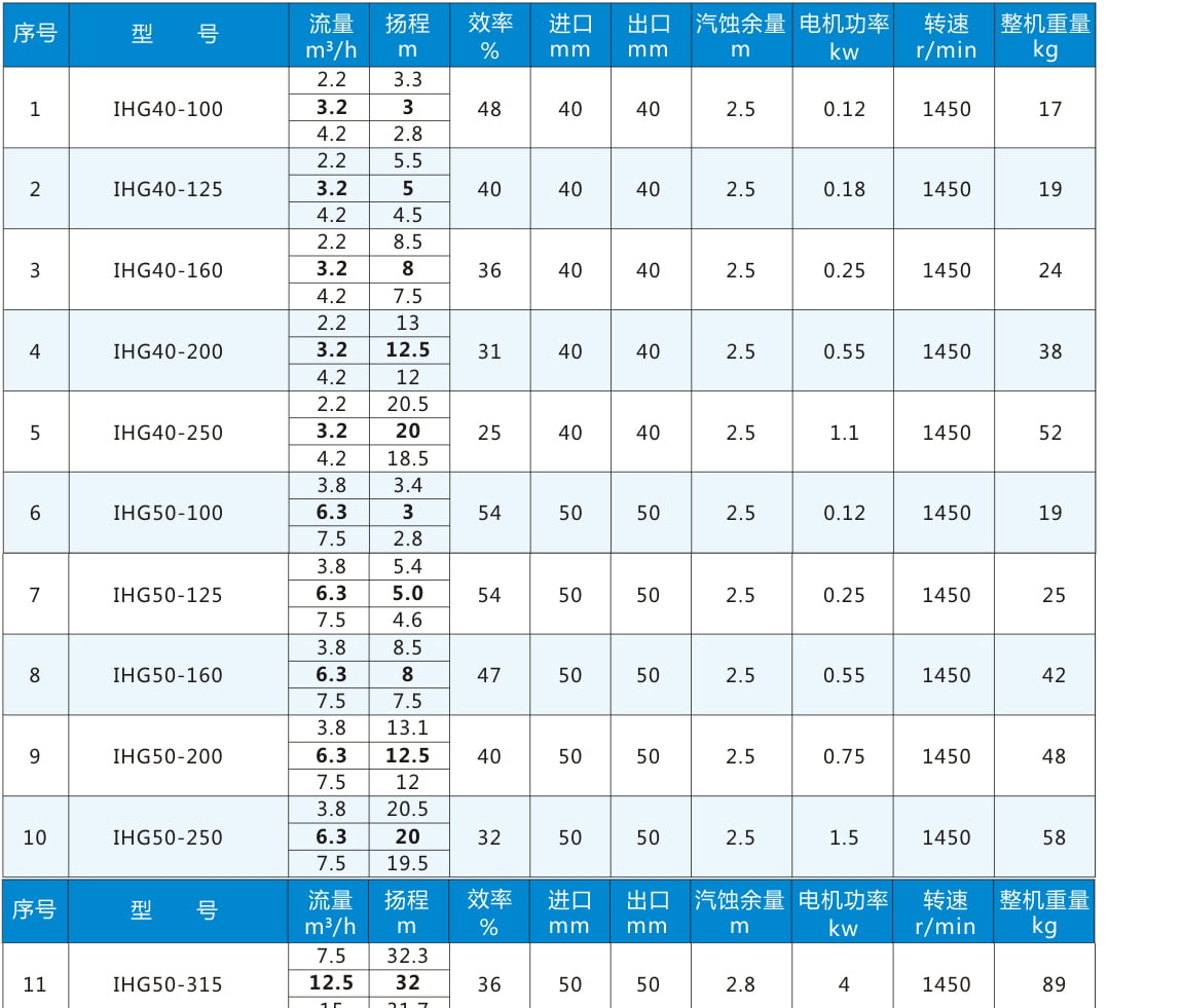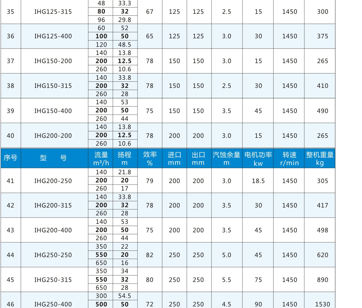 性能參數表二:電機轉速1450r/min,表中流量揚程加粗為額定參數
